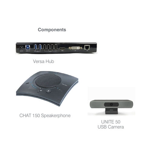 Versa Pro 50 to zestaw do podłączenia do komputera Windows lub MacOS do wideokonferencji lub do lokalnych prezentacji w sali konferencyjnej mieszczącej do 6 osób.