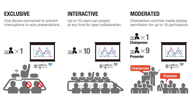 Kilka modeli projektorów z serii PT-VZ580* obsługuje zaawansowaną funkcję Miracast – pełnoekranowe odtwarzanie bezprzewodowe bez zakłóceń oraz transmisję wideo Full HD z urządzenia na ekran projekcyjny 1:1. Twoje urządzenie z systemem Android nawiązuje bezpośrednie połączenie Wi-Fi z projektorem, które pozwala na jego wykrycie i wyświetlenie za jego pośrednictwem zawartości ekranu. Projektory  obsługują tryb moderatora i funkcję podłączenia na bieżąco, dzięki czemu sprawdzają się idealnie jako narzędzia ułatwiające współpracę podczas spotkań.